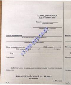 Заказать командировочное удостоверение военнослужащего в Фролове можно и по иным причинам, например, необходимо срочно ехать на учения или в зону боевых действий. В таком случае следует обращаться к руководству с заявлением. Если человек потерял, или испортил документы, он может обратиться в нашу компанию. Купить командировочное удостоверение военнослужащего с доставкой мы предлагаем недорого.
